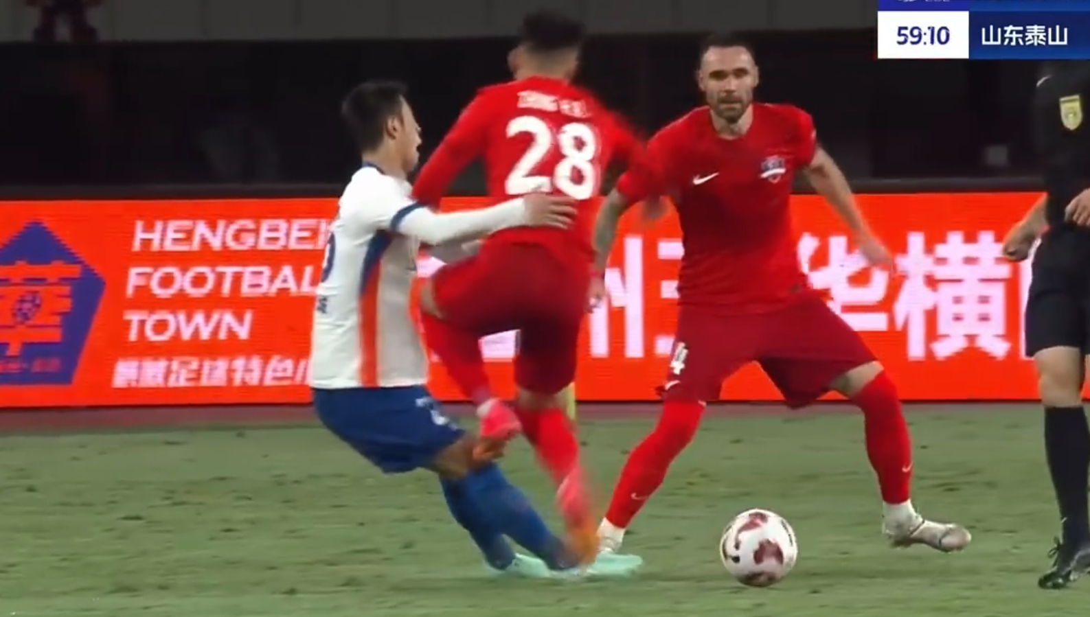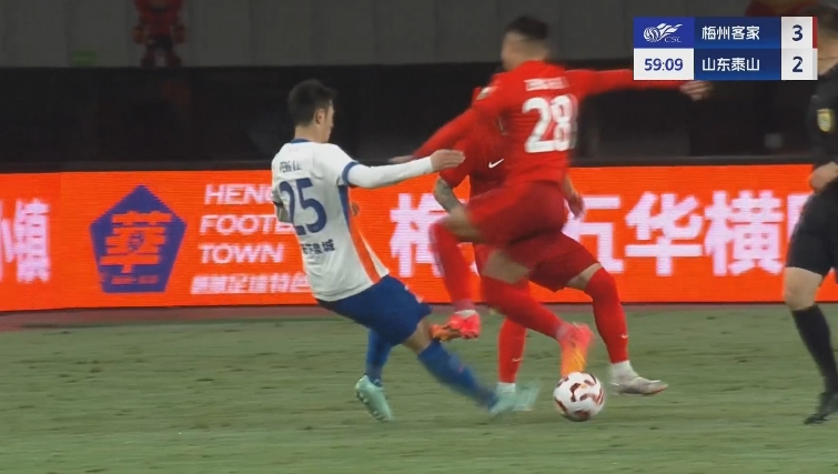 梅州客家3-4山東泰山 鐘浩然跳起搶斷,鞋底踩彭欣力膝蓋直紅下場↓