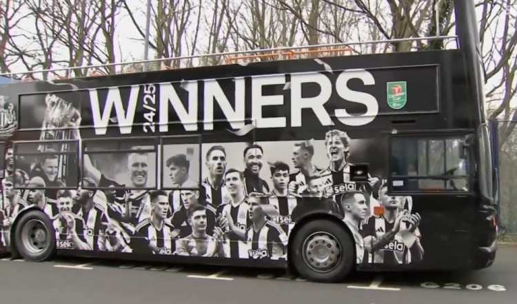 3月29日訊 紐卡斯爾今天將進行聯(lián)賽杯奪冠游行慶祝,現(xiàn)在教練和球員們將乘坐的大巴已經(jīng)亮相。