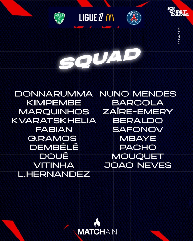 3月29日訊 北京時(shí)間明天凌晨2點(diǎn),巴黎將在法甲第27輪比賽中客場(chǎng)對(duì)陣圣埃蒂安,巴黎公布了此役的球員名單,登貝萊、杜埃、克瓦拉茨赫利亞在列,阿什拉夫、李剛?cè)省ⅠR尤盧缺席。