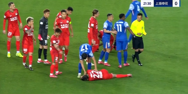 第23分鐘,申花左側角球機會,禁區(qū)內卡位時路易斯故意推搡黃銳烽,后者倒地,主裁黃牌警告路易斯↓