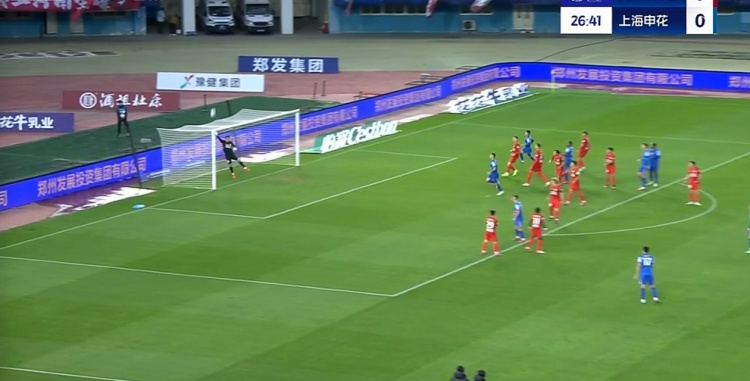 第27分鐘,申花前場左側定位球機會,高天意主罰,皮球直奔十分角,最終擊中門框彈出底線↓