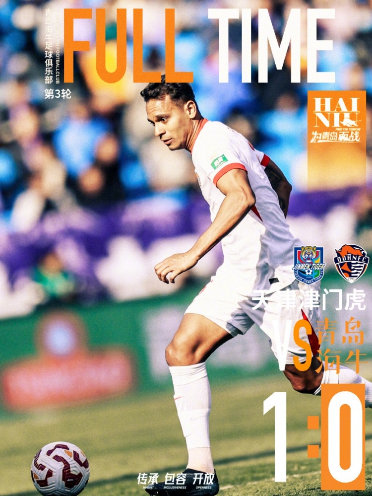 全場比賽結束,青島海??蛨?-1不敵天津津門虎。