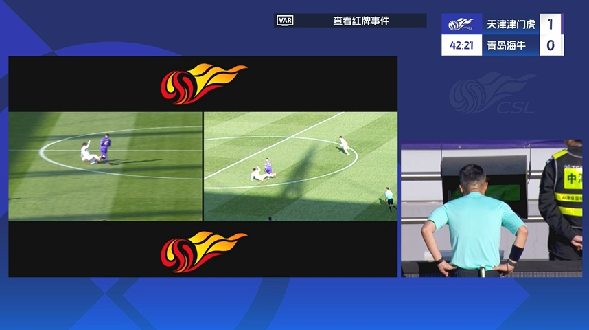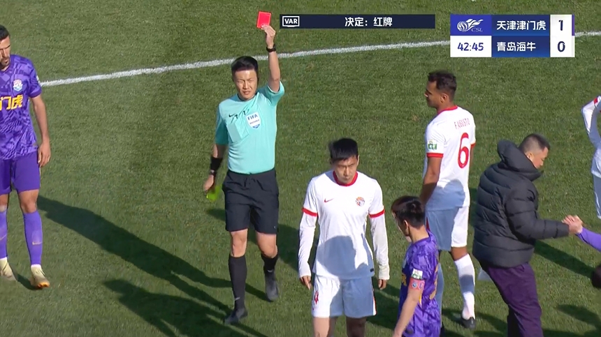 03月29日訊 中超第三輪,津門虎vs海牛。第42分鐘,海牛后衛(wèi)金洋洋飛鏟哈達(dá)斯,主裁起初出示黃牌,VAR介入后主裁改判紅牌將其罰下! 本文標(biāo)簽: 足球 中超 中國(guó)足球 天津津門虎 青島海牛