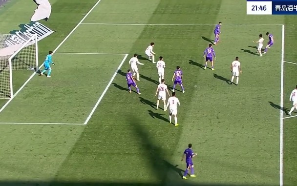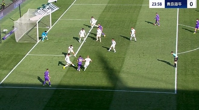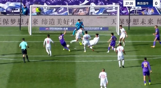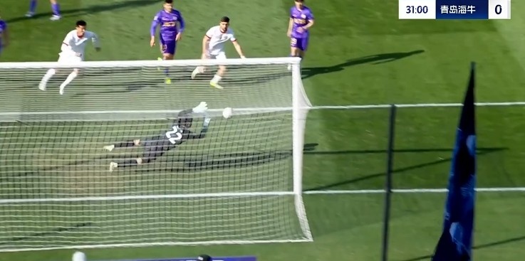 第31分鐘,青島海牛禁區(qū)里一次頭球攻門被門將飛身?yè)涑龅拙€?!?/p>