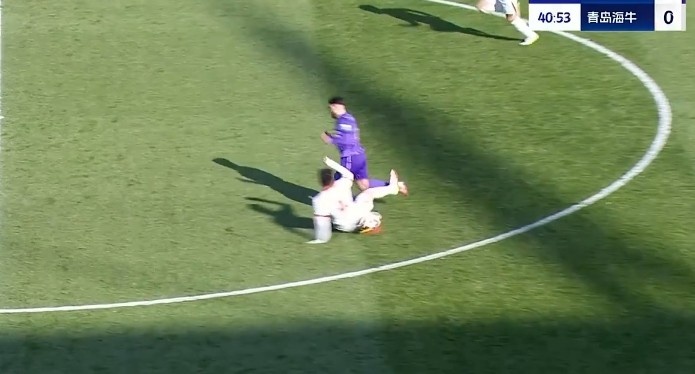 第40分鐘,金洋洋中場(chǎng)攔截飛鏟踢倒進(jìn)攻球員,主裁判第一時(shí)間出示黃牌?!?/p>