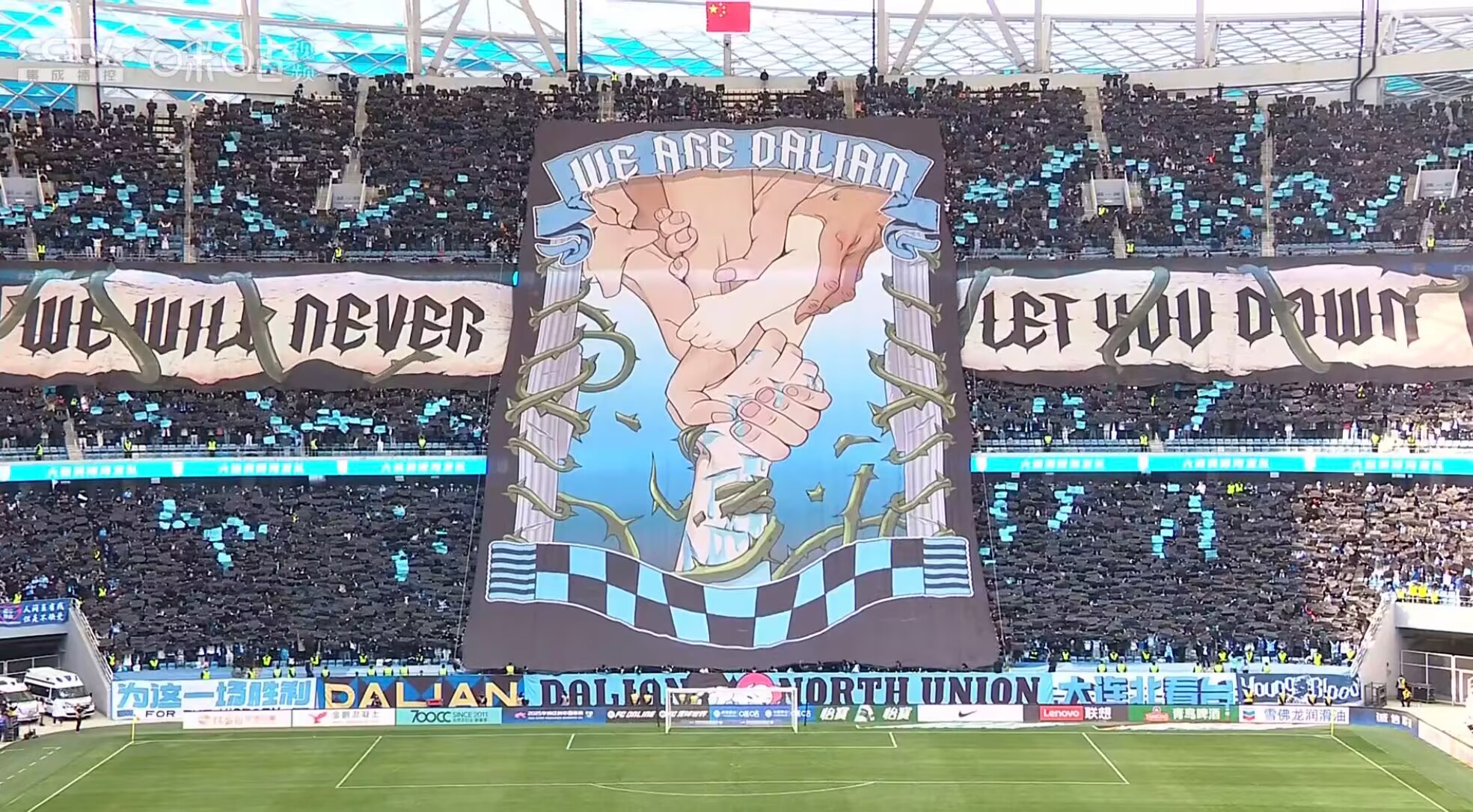 03月29日訊 中超第3輪,大連英博vs長春亞泰,大連梭魚灣迎來2025賽季主場首秀,賽前球迷升起了巨幅TIFO——我們是大連!