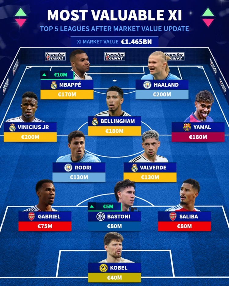3月31日訊 德國轉(zhuǎn)會市場更新了五大聯(lián)賽球員的身價(jià),并列出身價(jià)最高陣容,哈蘭德、姆巴佩、維尼修斯、貝林厄姆、亞馬爾在列。