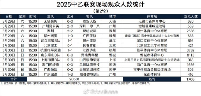 3月31日訊 據(jù)德轉中國區(qū)管理員朱藝統(tǒng)計,中乙第2輪場均現(xiàn)場觀眾1708人,四場比賽觀眾超千人,其中泰山B隊主場8113人最多。