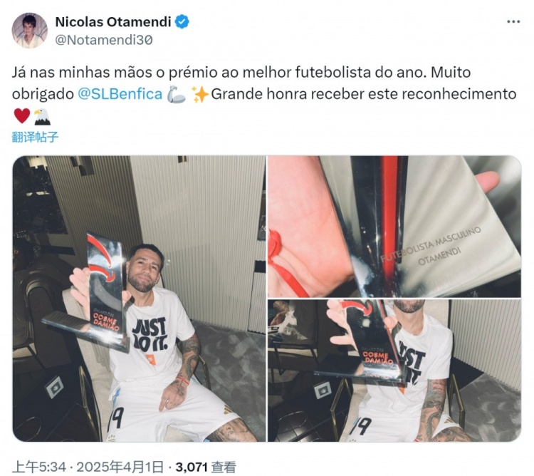 4月1日訊 在上個(gè)月的頒獎(jiǎng)典禮中,37歲中衛(wèi)奧塔門迪當(dāng)選本菲卡年度最佳球員,奧塔門迪今日在社交媒體上曬出手拿獎(jiǎng)杯的照片,并配文:“年度最佳球員獎(jiǎng)杯已經(jīng)在我手中,非常感謝本菲卡,很榮幸獲得這一認(rèn)可?!?/p> 本文標(biāo)簽: 足球 葡超