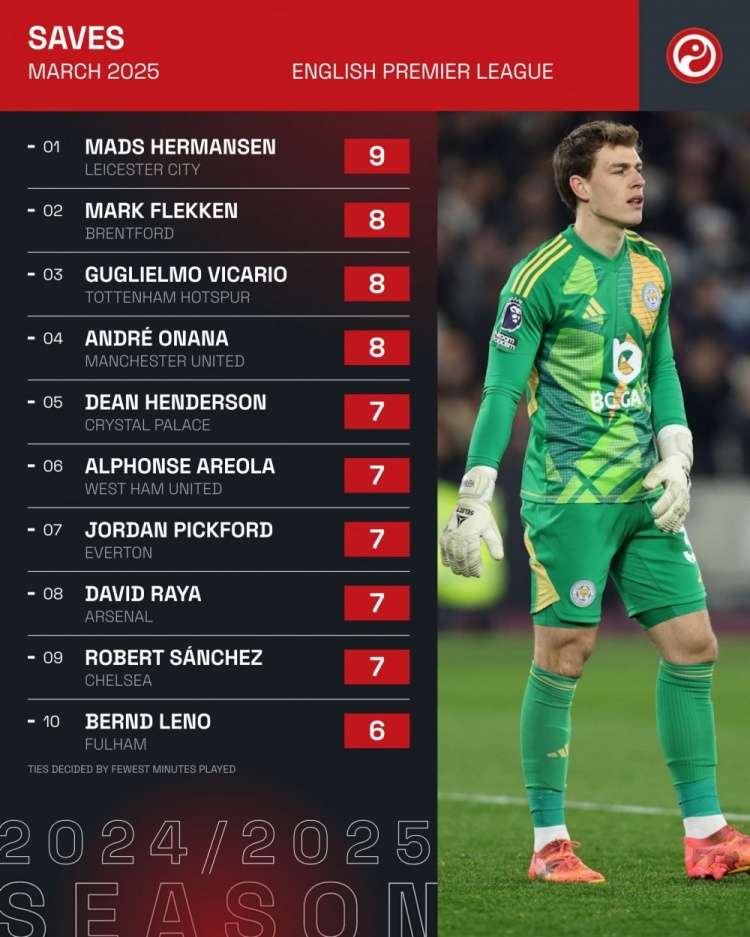 4月1日訊 Squawka統(tǒng)計了3月份英超門將的撲救次數,并列出榜單,赫爾曼森9次居首,弗萊肯、維卡里奧、奧納納8次并列第二。
