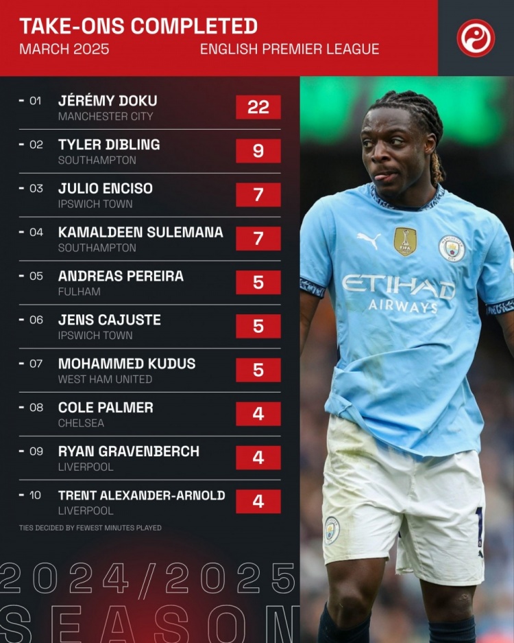 4月1日訊 Squawka統(tǒng)計(jì)了英超3月份球員的成功過人數(shù)據(jù),并列出榜單,曼城邊鋒多庫22次斷層居首,迪布林9次第二。值得一提的是,多庫的過人次數(shù)在英超球隊(duì)中也能排在第三位,僅次于曼城和南安普頓。