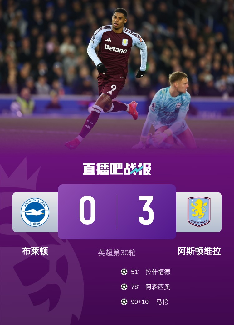 英超-維拉3-0布萊頓各賽事六連勝 拉什福德連場(chǎng)破門阿森西奧傳射