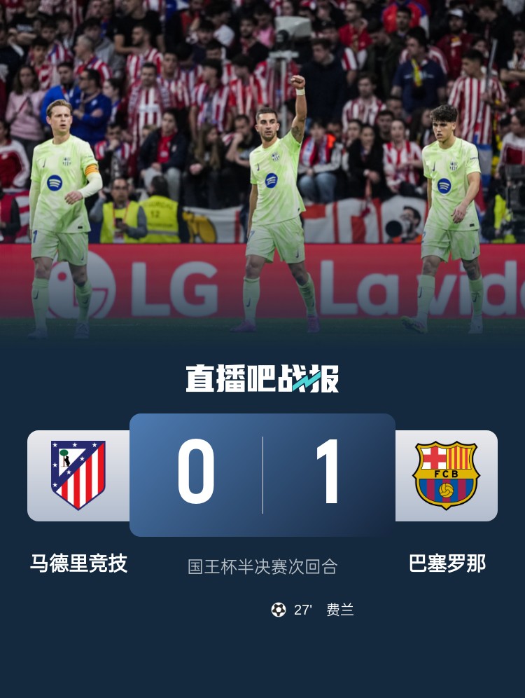 費(fèi)蘭制勝,巴薩客場(chǎng)1-0戰(zhàn)勝馬競(jìng),總比分5-4淘汰馬競(jìng)進(jìn)軍國王杯決賽,將對(duì)陣皇馬。