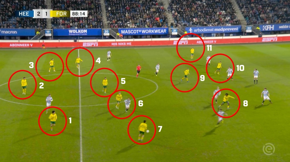 比賽踢到第87分鐘,海倫芬還以2-1領先。福圖納隊進行了兩次換人,但在其中一次換人后,被換下的人沒有離開,還是留在了場上。于是場上出現(xiàn)了12vs11的怪異景象。很快,福圖納在場上有12名球員的情況下獲得了一個角球,此時裁判才發(fā)現(xiàn)問題,讓場上恢復為11vs11。而福圖納利用這個角球扳平了比分。