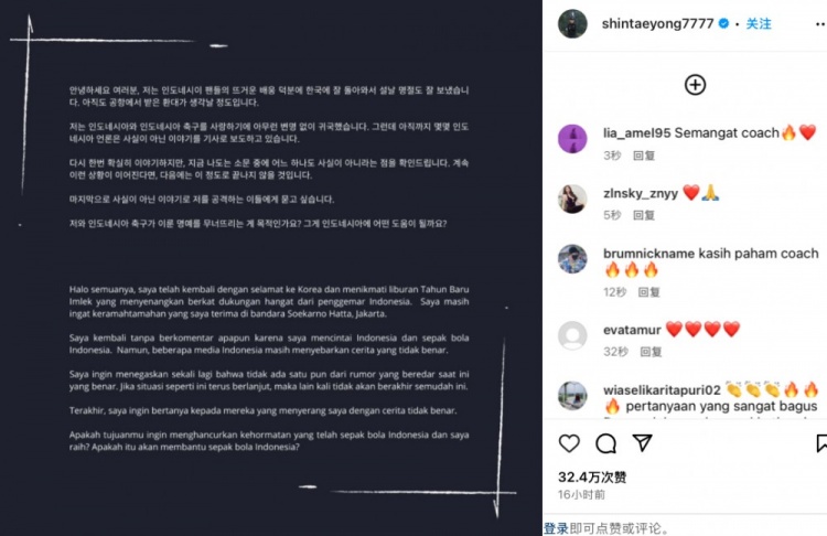 2月2日訊 今日前印尼主帥申臺龍更新社媒,用韓語和印度尼西亞語發(fā)布聲明,對部分印尼媒體進行警告。