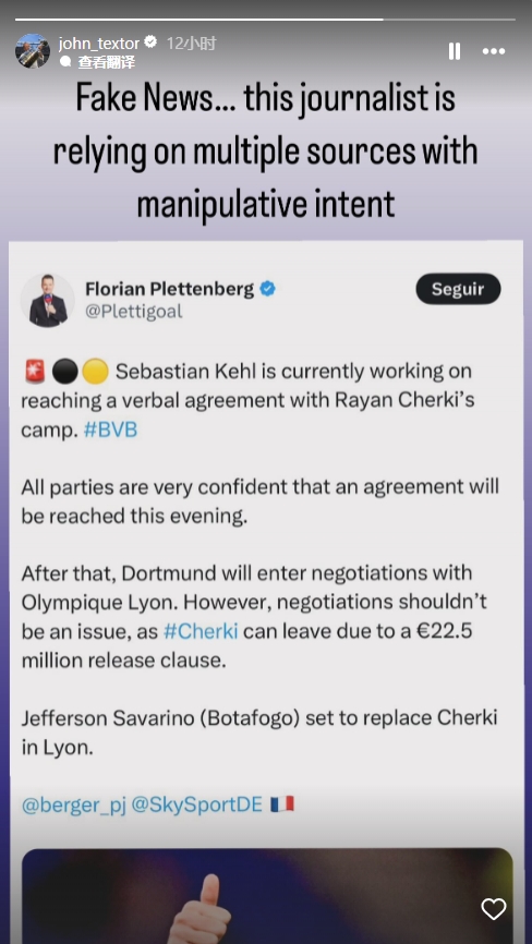 里昂俱樂部老板特克斯托在社交媒體上轉(zhuǎn)發(fā)這條消息,并配文:“假新聞,這名記者依賴多個消息來源,帶有操縱意圖?!?/p>