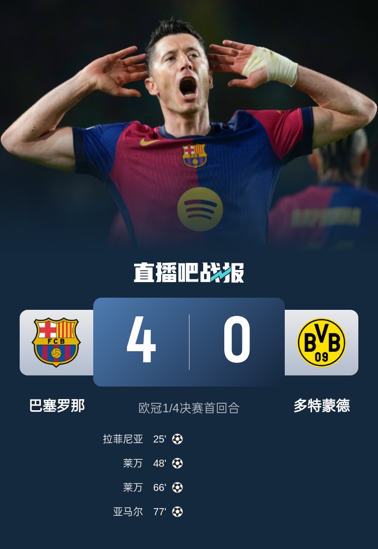 歐冠8強首回合,巴薩4-0大勝多特!萊萬雙響,亞馬爾、拉菲尼亞破門!懸念已無了嗎?