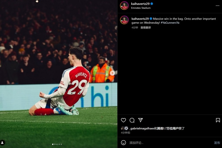 哈弗茨曬出自己進(jìn)球后滑跪慶祝的照片,并寫道:收獲一場(chǎng)大勝,現(xiàn)在迎接下一場(chǎng)重要的比賽!