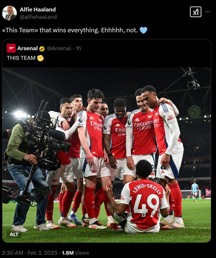 阿森納社媒曬出斯凱利模仿哈蘭德慶祝時,其余球員圍繞著他的照片,并寫道:這支球隊。