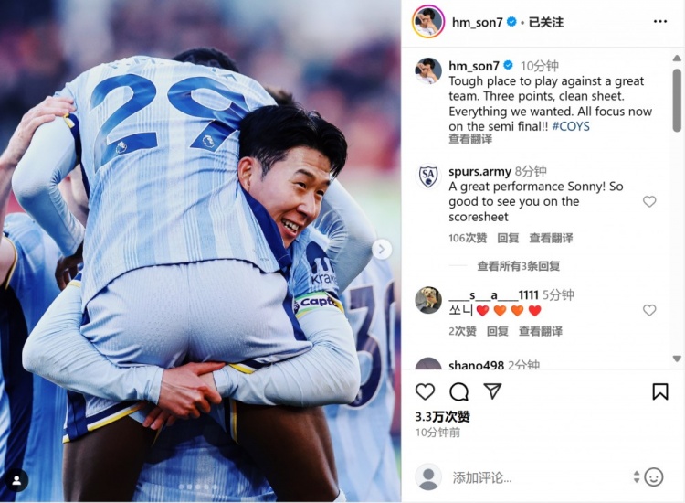 2月3日訊 在本輪英超,熱刺2-0擊敗布倫特福德。本場比賽孫興慜一次造烏龍還有一次助攻,賽后他也在個人社媒曬出與隊友相擁慶祝的照片,配文寫道:“一個艱難的客場面對一支出色的球隊,拿下三分,完成零封,這是我們?nèi)肯胍模F(xiàn)在集中注意在聯(lián)賽杯半決賽。” 本文標(biāo)簽: 足球 英超 熱刺