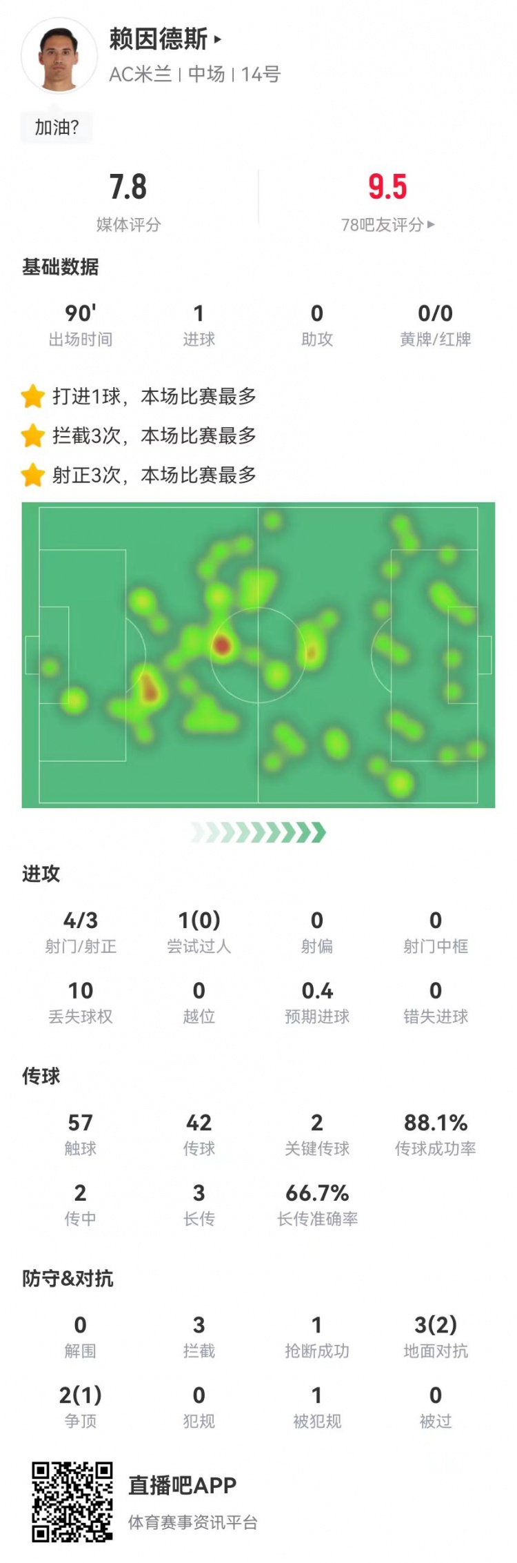 2月3日訊 米蘭在本輪意甲1-1戰(zhàn)平國米,賴因德斯本場(chǎng)數(shù)據(jù)如下: