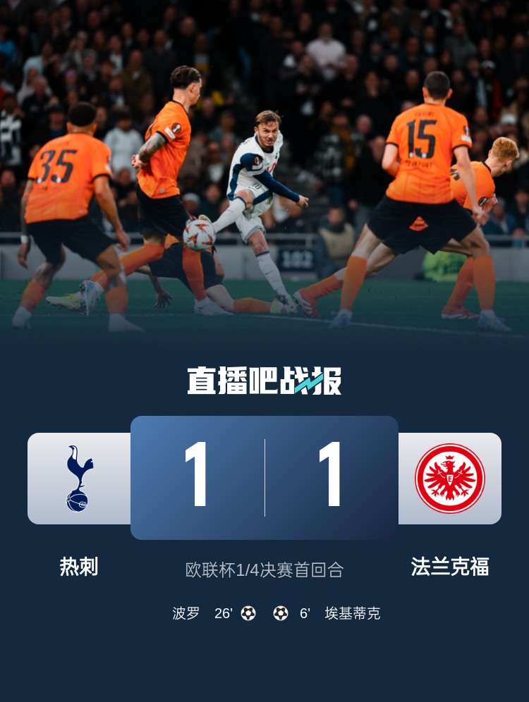 埃基蒂克首開紀(jì)錄,波羅扳平比分,最終熱刺首回合1-1戰(zhàn)平法蘭克福。