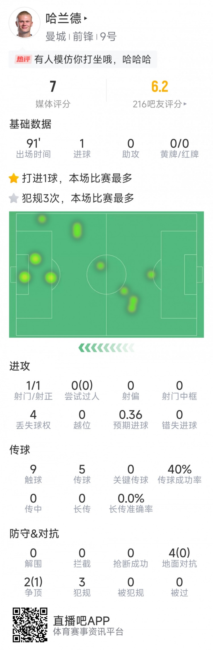 2月3日訊 在本輪英超,曼城1-5不敵阿森納,哈蘭德打進一球,以下為他在本場數(shù)據(jù):1粒進球1次射門9次觸球5次傳球傳球成功率40%6次對抗1次成功3次犯規(guī)sofa評分7分 本文標簽: 足球 英超 曼城 阿森納