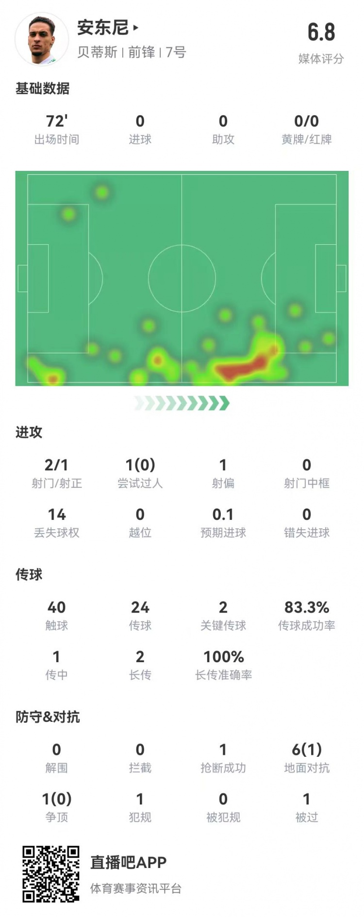 2月3日訊 貝蒂斯在本輪西甲2-2暫時(shí)戰(zhàn)平畢巴,從曼聯(lián)外租而來(lái)的安東尼首秀數(shù)據(jù)如下:
