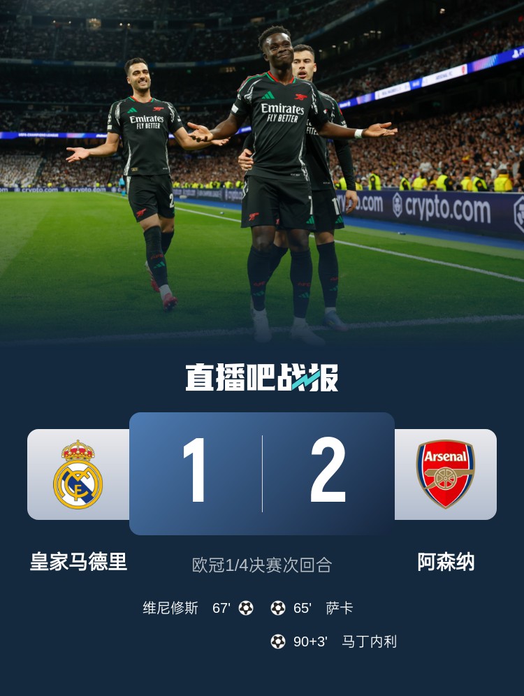 歐冠1/4決賽次回合,阿森納客場(chǎng)2-1皇馬,總比分5-1晉級(jí)四強(qiáng),薩卡、馬丁內(nèi)利進(jìn)球。