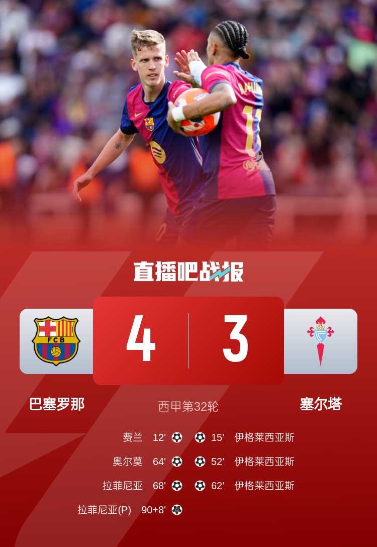 04月20日訊 西甲第32輪,巴薩主場4-3擊敗塞爾塔上演大逆轉(zhuǎn),本輪先賽領(lǐng)先皇馬7分。