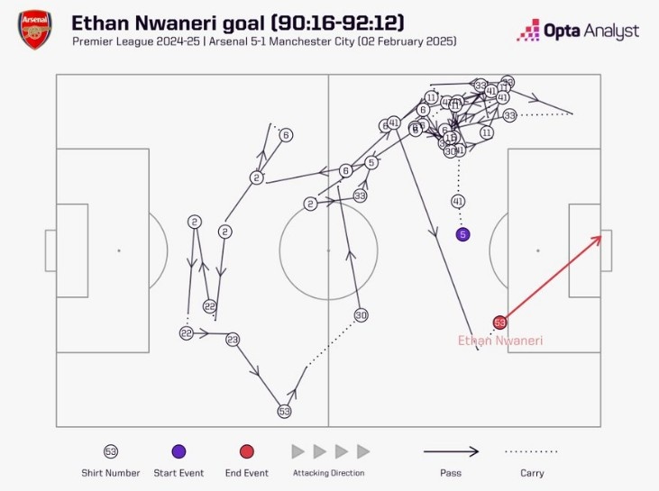 記者表示:我正在重溫阿森納對(duì)陣曼城時(shí)恩瓦內(nèi)里打進(jìn)的那粒進(jìn)球??厍驎r(shí)間1分54秒,連續(xù)傳球36腳,每名外場(chǎng)球員都有觸球,賴斯的轉(zhuǎn)移球以及最后的弧線球完成了終結(jié)。我知道曼城的表現(xiàn)很糟糕,但這粒進(jìn)球令人難以置信,本賽季最佳進(jìn)球之一。