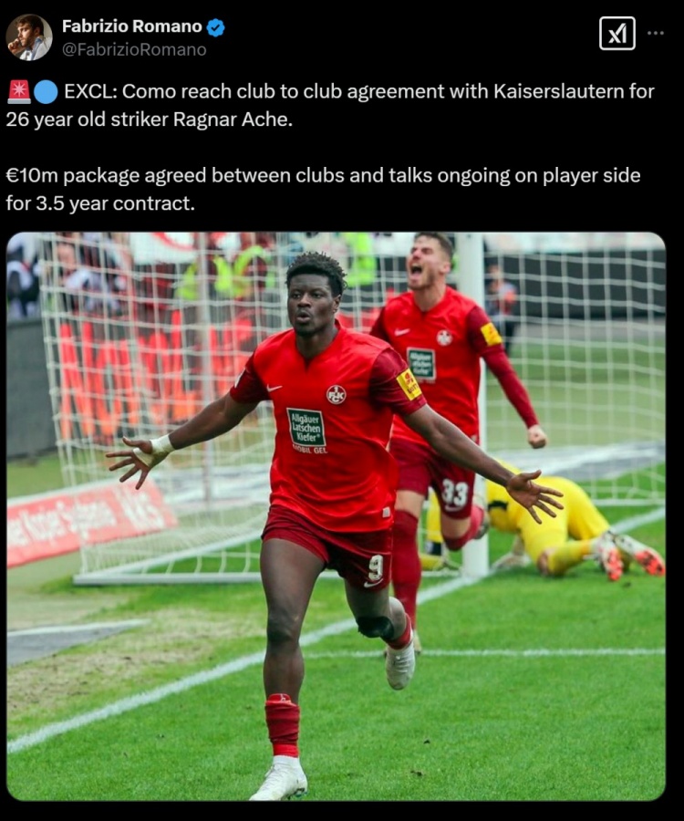 2月3日訊 名記羅馬諾獨(dú)家消息,科莫與德乙球隊(duì)凱澤斯勞滕達(dá)成協(xié)議,將簽下26歲前鋒阿徹。