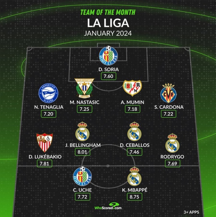 2月4日訊 whoscored統(tǒng)計了西甲1月的評分最佳陣,姆巴佩、貝林厄姆領(lǐng)銜。