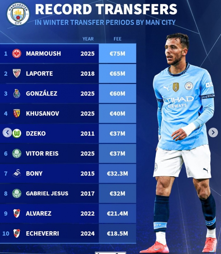 2月4日訊 曼城已經(jīng)官宣簽下波爾圖中場尼科-岡薩雷斯,《轉(zhuǎn)會市場》也統(tǒng)計了曼城隊史冬窗引援榜情況。