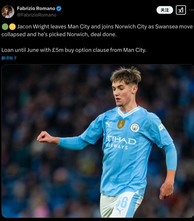羅馬諾在社媒寫道:“盡管加盟斯旺西的談判破裂,不過雅各布-賴特依舊將離開曼城,球員選擇租借加盟到諾維奇效力。租期到今年6月止,合約中附帶500萬鎊選擇買斷條款。”