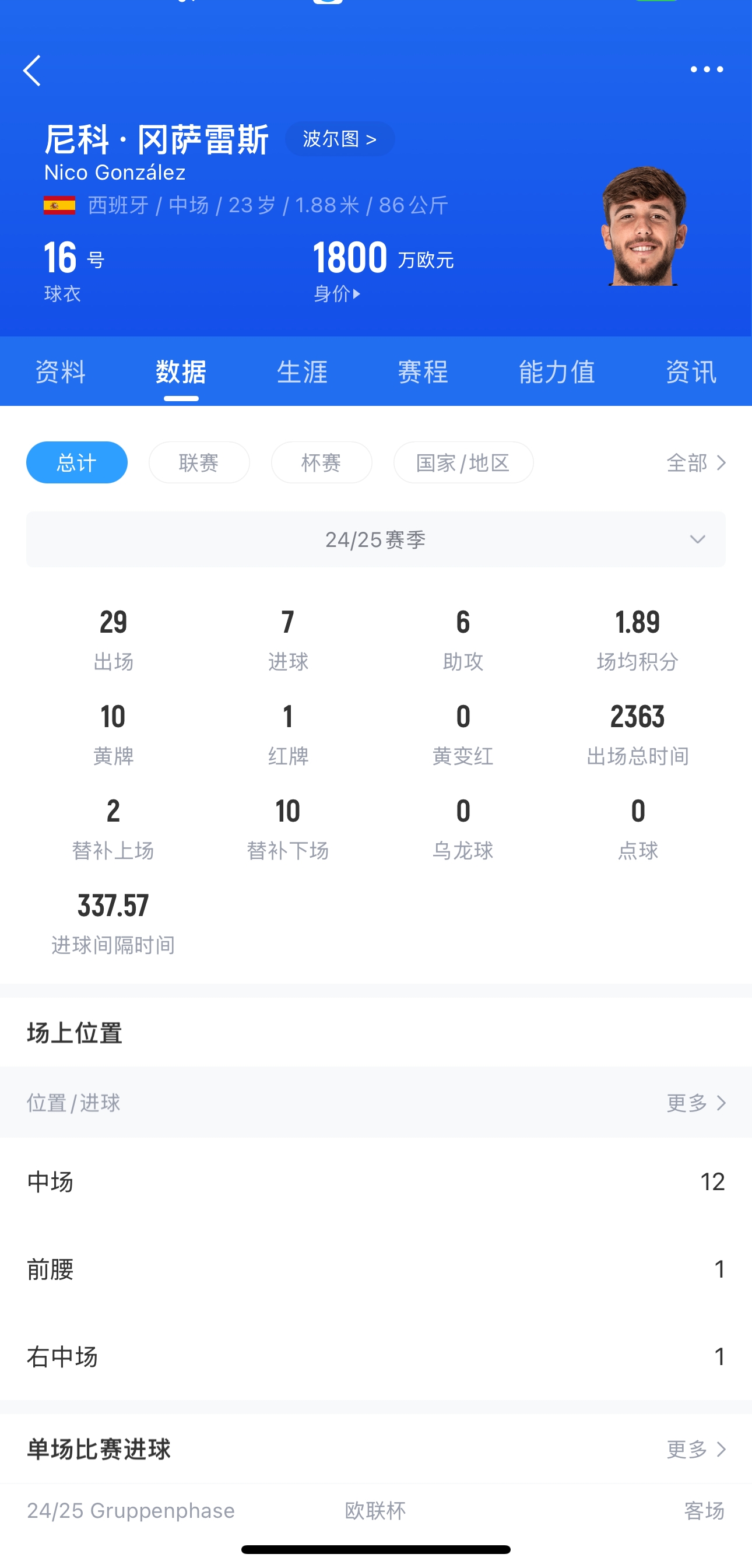 尼科-岡薩雷斯,現(xiàn)年23歲,西班牙中場,出自拉瑪西亞青訓,2023年夏窗波爾圖花費840萬歐簽下球員,本賽季尼科代表波爾圖出戰(zhàn)29場比賽,貢獻7球6助,目前球員德轉(zhuǎn)身價1800萬歐。