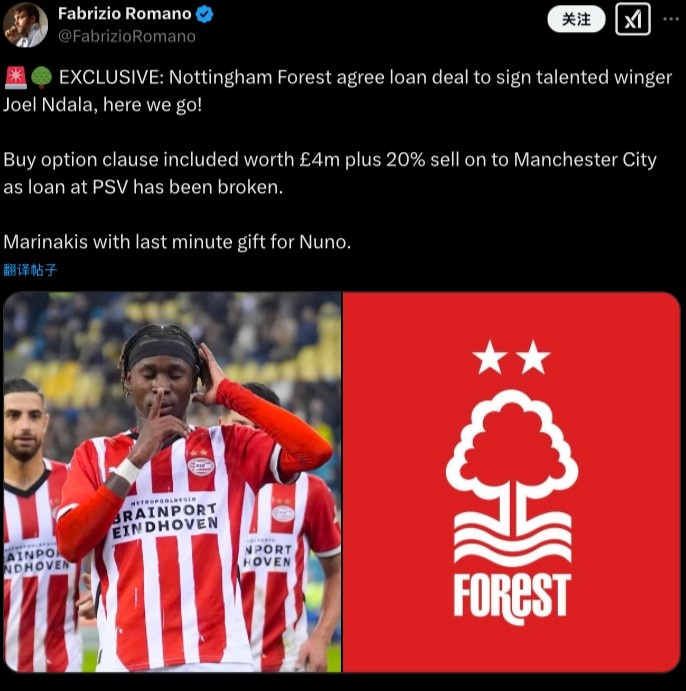 羅馬諾在社媒寫道:“獨(dú)家消息:諾丁漢森林同意以租借方式簽下天才邊路球員喬爾-恩達(dá)拉,HWG!由于曼城和埃因霍溫就球員租借的相關(guān)事項(xiàng)已經(jīng)破裂,諾丁漢森林從中介入,據(jù)悉租借合同中將附帶400萬鎊+20%未來轉(zhuǎn)會(huì)分成的買斷條款。”