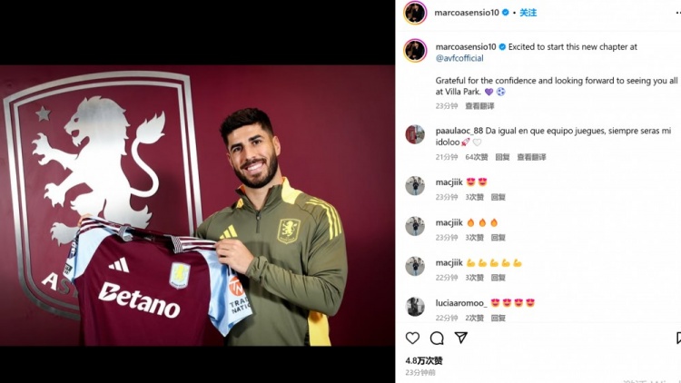 阿森西奧曬出自己手持維拉球衣的加盟照,并配文:“很興奮能在維拉開啟這一新的篇章。感激球隊(duì)對我的信任,也期待在主場和球迷們相見?!?/p>