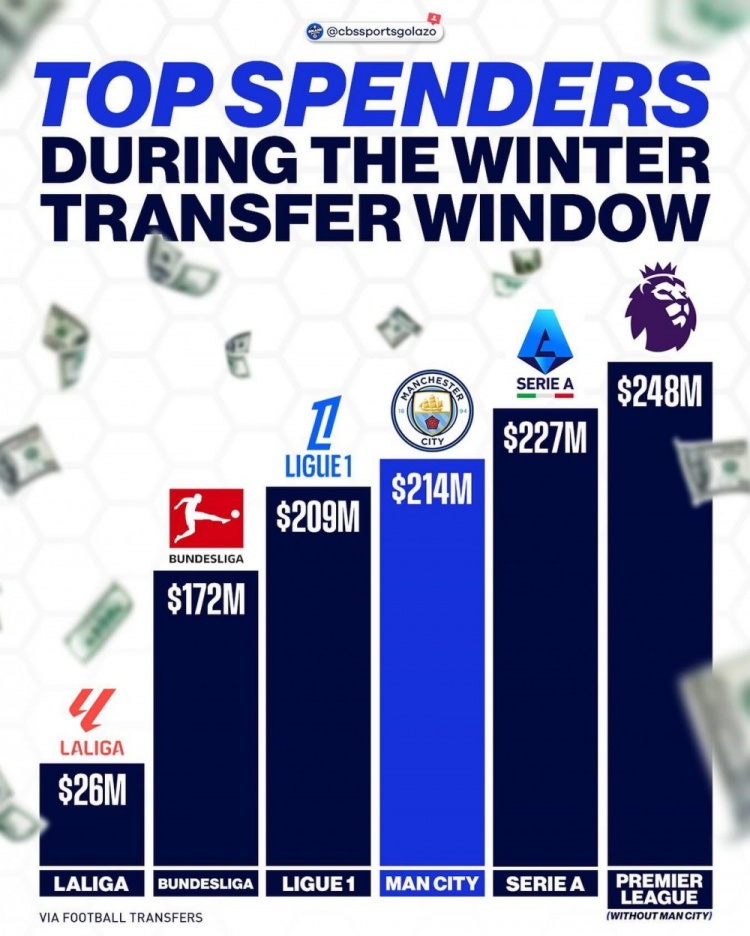 破費(fèi)2.18億歐元簽入5名球員,超過(guò)西甲、德甲和法甲整個(gè)聯(lián)賽的花費(fèi),僅支付的溢價(jià)便超過(guò)1億歐元,過(guò)去的這個(gè)冬窗是屬于曼城的獨(dú)角戲,瓜迪奧拉已經(jīng)做好了圍繞哈蘭德進(jìn)行全面重建的準(zhǔn)備。