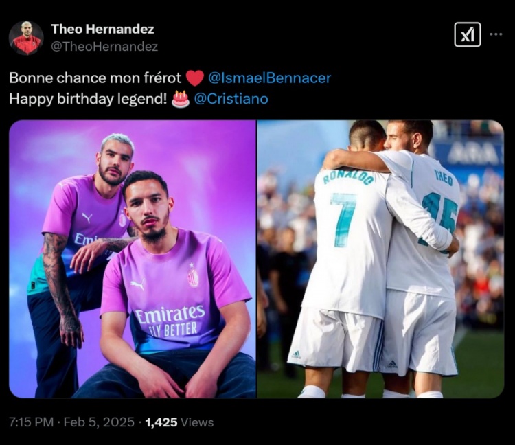 2月5日訊 今天是C羅40歲的生日,特奧也向他送上了生日祝福,同時(shí)還告別了離開米蘭加盟馬賽的本納塞爾。特奧曬出與兩人的合照,并寫道:@本納塞爾,祝你好運(yùn),我的兄弟。@C羅,生日快樂,傳奇!特奧曾在2017-18賽季加盟皇馬,和C羅做過1年的隊(duì)友。 本文標(biāo)簽: 足球 意甲 AC米蘭 西甲 皇家馬德里 馬賽 C羅