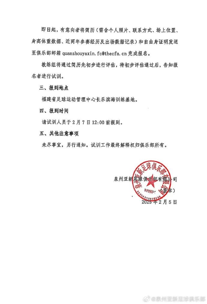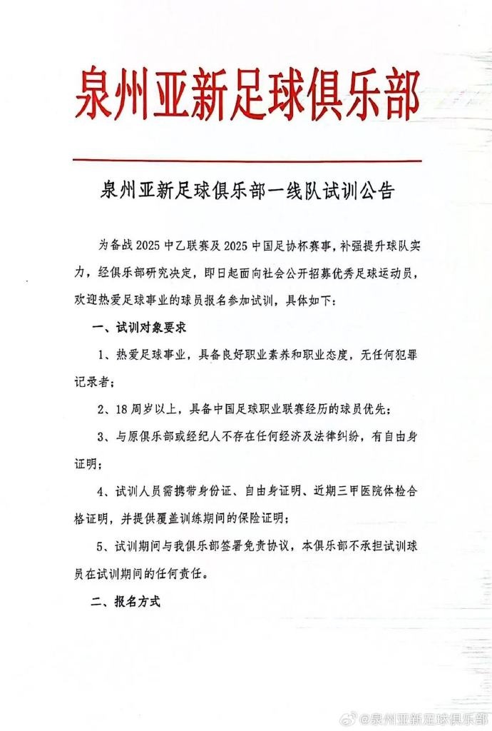 泉州亞新官方表示,為備戰(zhàn)新賽季中乙聯(lián)賽及中國足協(xié)杯,補(bǔ)充提升球隊實力,俱樂部決定公開招募優(yōu)秀足球運(yùn)動員。