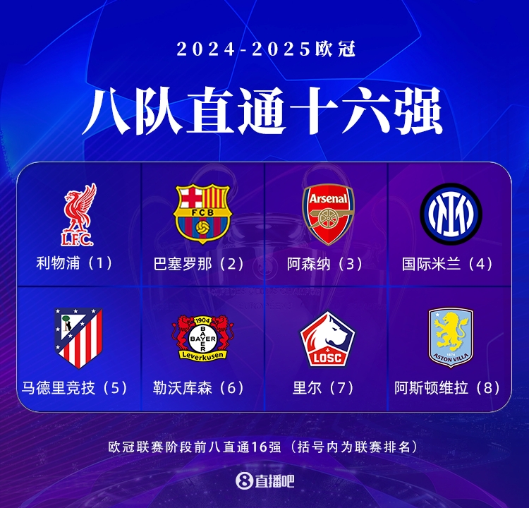 “聯(lián)賽階段”打完有8支隊(duì)伍拿到了直通淘汰賽的資格,分別是(按排名)利物浦、巴塞羅那、阿森納、國(guó)際米蘭、馬德里競(jìng)技、勒沃庫(kù)森、里爾和阿斯頓維拉。前四位雖然都是豪門級(jí)別,馬競(jìng)也算是歐冠老手了,不過(guò)勒沃庫(kù)森、里爾、維拉的突圍還是很多人沒(méi)想到的。特別是在跟很多強(qiáng)手過(guò)招后,他們還能出現(xiàn)在這個(gè)位次,真的不是浪得虛名。