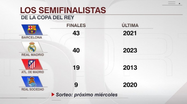 2月7日訊 西班牙國王杯1/4決賽戰(zhàn)罷,皇馬、巴薩、馬競、皇家社會晉級半決賽。ESPN統(tǒng)計了四支半決賽球隊歷史上晉級國王杯決賽的次數(shù),巴薩以43次居首,皇馬40次第二。4支國王杯半決賽球隊歷史晉級決賽次數(shù)(括號內(nèi)為最近奪冠年份):巴薩——43(2021)皇馬——40(2023)馬競——19(2013)皇家社會——9(2020) 本文標簽: 足球 西甲 皇家馬德里 巴塞羅那 馬德里競技 皇家社會