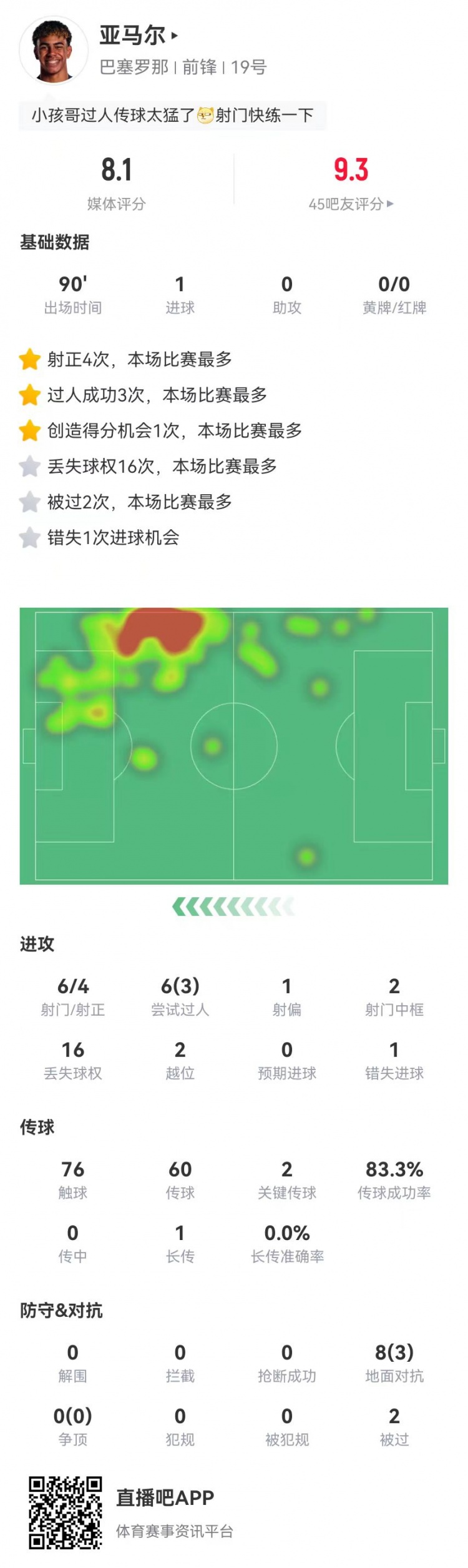 2月7日訊 巴薩在本輪國王杯5-0大勝瓦倫,亞馬爾本場數(shù)據(jù)如下: