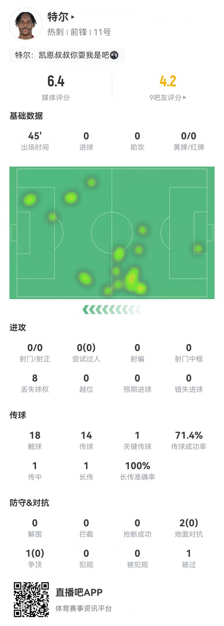 2月7日訊 熱刺在本輪聯(lián)賽杯0-4不敵利物浦,花費(fèi)了1000萬歐租借費(fèi)的新援特爾首秀數(shù)據(jù)如下:替補(bǔ)出場45分鐘0射門18觸球1關(guān)鍵傳球1傳中、0成功1長傳、1成功3對抗、0成功8丟失球權(quán)1被過獲評6.4分 本文標(biāo)簽: 足球 德甲 拜仁慕尼黑 英超 利物浦 熱刺