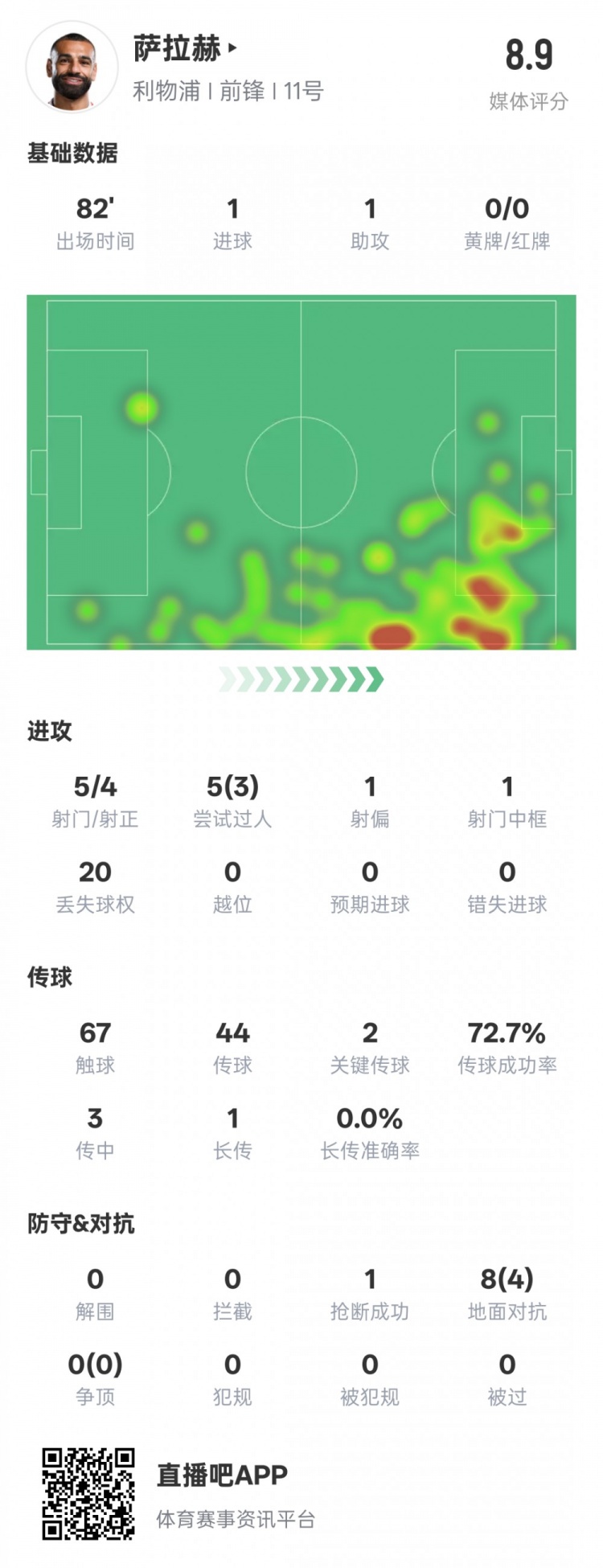 2月7日訊 英聯(lián)杯半決賽次回合,利物浦對陣熱刺,薩拉赫首發(fā)出戰(zhàn),傳射建功,還送出2次關(guān)鍵傳球,3次過人成功,評分8.9。