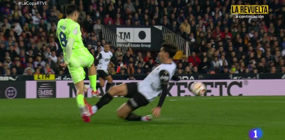 比賽開場8分鐘,瓦倫球員雨果-吉利亞蒙亮鞋釘飛鏟佩德里,后者痛苦倒地。但裁判連黃牌也沒出。