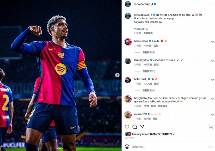 1月30日訊 在本輪歐冠,巴薩2-2戰(zhàn)平亞特蘭大。本場(chǎng)比賽阿勞霍下半場(chǎng)破門得分,這也是他自2023年11月以來首次為巴薩破門,賽后他也在個(gè)人社媒曬出本場(chǎng)慶祝進(jìn)球的照片,配文寫道:“主場(chǎng)作戰(zhàn)的歐冠之夜!球隊(duì)歐冠第一階段表現(xiàn)不錯(cuò),16強(qiáng)我們來了!” 本文標(biāo)簽: 足球 西甲 巴塞羅那