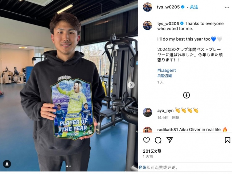 渡邊剛在社媒寫(xiě)道:“感謝所有投票支持我的人,今年我也會(huì)全力以赴。很榮幸被選為球隊(duì)2024年度最佳球員,今年也要繼續(xù)加油!”
