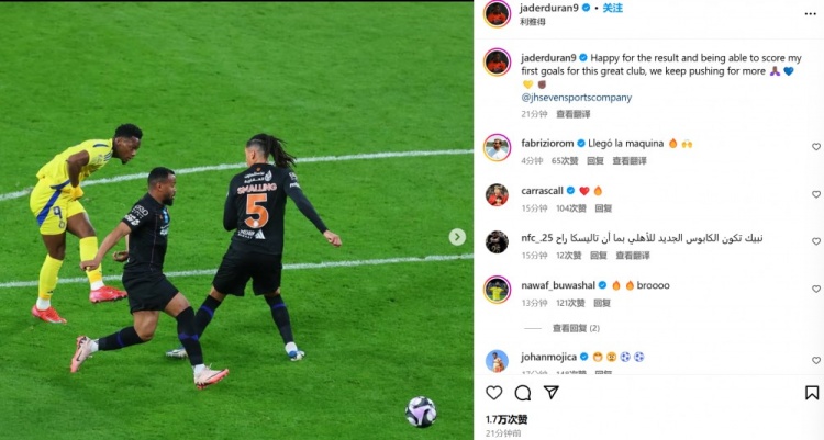2月8日訊 利雅得勝利在本輪沙特超3-0輕取費(fèi)哈,新援杜蘭首秀雙響建功并獲評(píng)官方本場(chǎng)最佳。他也在賽后通過社媒曬出自己的比賽照,并配文:“對(duì)勝利感到高興,也很開心能夠?yàn)檫@家的偉大俱樂部打進(jìn)我的處子球,我們會(huì)繼續(xù)努力爭(zhēng)取贏得更多?!?/p> 本文標(biāo)簽: 足球 利雅得勝利 五洲